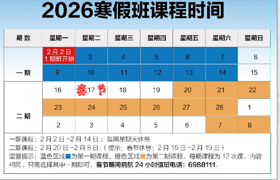 课程采用蓝色、橙色区域分别标注一期、二期时间节点,清晰直观,方便学员和家长快速规划学习安排。春节期间启航教育还开通24小时值班电话6988111,随时为家长和学员解答疑问。
