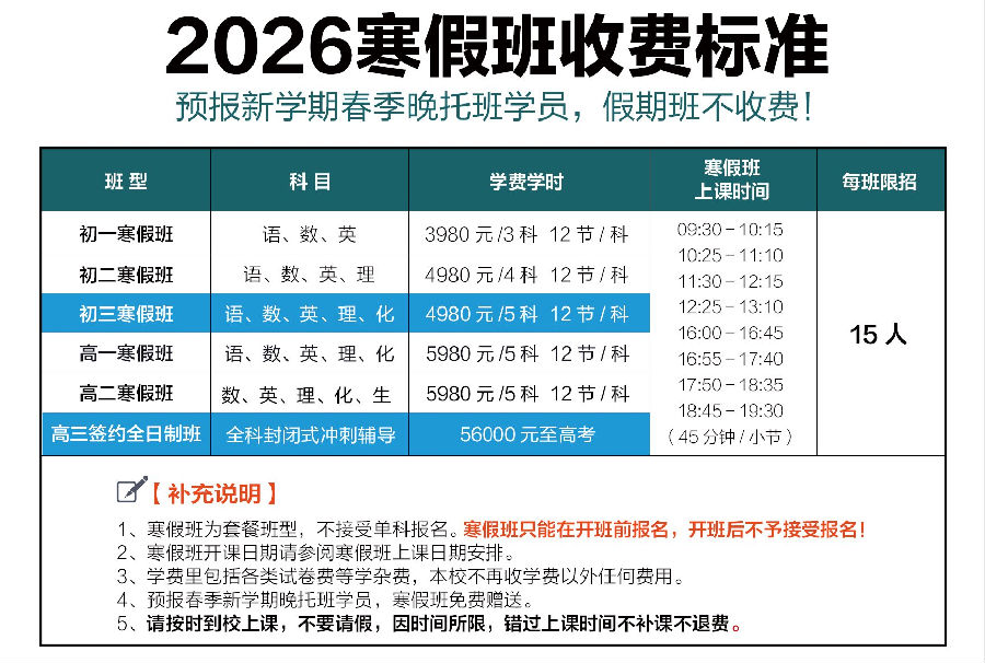 班型收费分层设计,晚托班福利加码寒假班覆盖初一至高三全学段,结合不同年级的学习重点定制班型与收费标准,每班严格限招15人,保障小班教学的针对性与高效性: